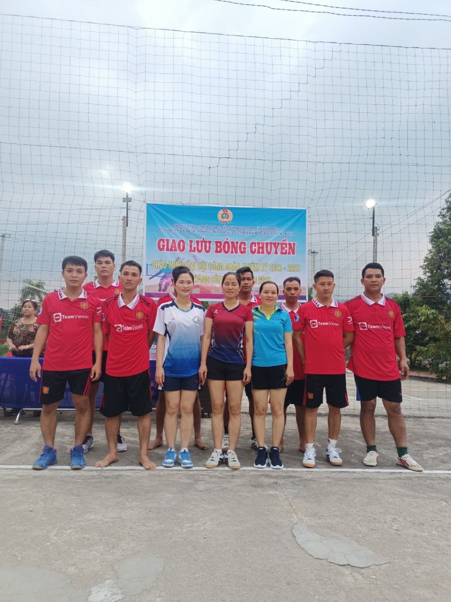 Cầu thủ đội bóng chuyền Ban QL rừng phòng hộ chụp hình lưu niệm trước khi giao lưu bóng chuyền chào mừng Đại hội Công đoàn CS